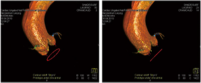 現在のHybrid ORでは,いわゆるCTライクイメージングであるコーンビームCT(以下,“syngo DynaCT”)も手術中の画像支援として用いられている。特に,手術室では,麻酔器や超音波装置などの医療機器が患者頭側周辺にて用いられるので,患者頭部方向からアームを挿入して回転させるよりも,患者側方よりアームを挿入して回転撮影を行うことが求められており,このニーズに天吊り・床置きいずれも対応できるのは当社の利点と言える。このsyngo DynaCTは,従来の高コントラストを中心とした3D angioやDA/DSAでは撮影が難しかった低コントラストの描出能が高く,ステントグラフト内挿術におけるエンドリークの確認(図4)などでも利用される。また,術前の大動脈などのCT画像を血管撮影装置の透視画像に重ねて3D ロードマップとして利用する場合にも用いられ,手術支援画像として役立てられている。最近では大動脈弁近傍のsyngo DynaCT撮影を行い,TAVR(経カテーテル的大動脈弁置換術)をガイドする“syngo Aortic ValveGuide”(図5)というソフトウエアも導入され,さらなる3Dイメージング技術の手術中の利用が進んでいる。