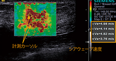 用手的な加振が不要であるため,操作者の手技に依存するところが少ないエラストグラフィです。視覚的な組織弾性イメージングに加えて,シアウェーブ伝搬速度によって局所の組織硬度を定量的に評価することが可能です(図3)。