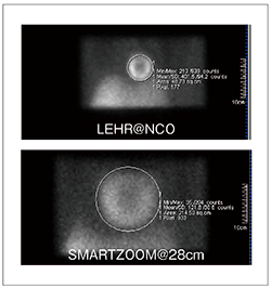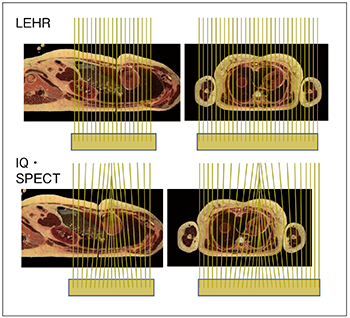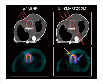 IQ・SPECTは,次に挙げる3つの特長からなる。1つ目の特長は,単位時間あたりに対象臓器から収集される情報量を増加させるため,視野の一部領域を拡大するSMARTZOOMコリメータ(以下,SMARTZOOM)という多焦点コリメータが採用されていることである。図2に示すように,低エネルギー高分解能平行多孔コリメータ(以下,LEHR)と SMARTZOOMでの胸部ファントムの撮像を比較した場合,SMARTZOOMでは視野の中心部にある心筋模型部が拡大されることがわかる。どちらの場合も,胸部ファントムの全体が撮像でき,トランケーションは見られない。2つ目の特長は,心臓を中心として半径28cmの軌道を取って回転するように設計されていることである。SMARTZOOMを用いた場合,視野内の拡大率は,検出面の座標位置によって異なる。視野内の拡大率を活用するためには,被写体と検出器の距離を置いて収集する必要が発生する。これらを考慮し,IQ・SPECTでは心臓が常に拡大率が4倍のところにあるような回転軌道が取られる。3つ目の特長は,共役勾配法(ordered subset conjugate gradient method)に基づく高速画像再構成法の採用である。SMARTZOOMが,平行線でなく特徴的な幾何学的配置であるため,より正確な生データの収集が必要となり,さらに従来型のSPECT再構成法で行われていた近似モデルでは不十分で,実測値に基づく演算が行われるようになった。新たに加わった補正項としては,vector mapによるコリメータ孔の向きの補正,コリメータ孔の形状に基づいた三次元点拡がり応答関数の適用,重力によるガントリのたわみ補正が挙げられる。さらに,従来型の画像再構成とは異なり,補正は生データに直接加えず,再構成内で演算されるというデータ不可侵の原則を採用し,生データのPoisson分布に影響を与えない取り扱いとなっている。新たな投影演算子が膨大に増えたことにより,処理時間の最適化が必要となり,補正項が多くても収束が速い再構成法が必要となった。また,その逆も真であり,収束が速い再構成法を使用するためには,より正確な生データの入力が必要となったとも言える。