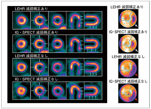このような減弱の仕組みは,性別による体格の違いや欠損の有無に影響し,特徴的な心筋血流分布を示すことになる。図4に,前璧中隔および下側壁に欠損のあるファントムを用い,LEHRとIQ・SPECTで撮像し,減弱補正の有無で比較した結果を示す。減弱補正を行わない場合,LEHR,IQ・SPECT共に4時方向の集積低下の規模が大きく,欠損の評価が困難になった(図4 )。しかし,減弱補正を施すことにより,このような集積低下は改善し,IQ・SPECTとLEHRで類似した画像が見られ,集積が正しく反映された画像となった(図4 ←)。