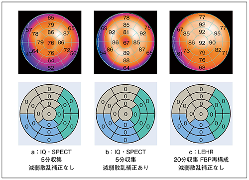 図5では,正常例において収集および再構成条件に適切なデータベースを用いてスコアリングを行った結果を示す。左側と中央は,それぞれIQ・SPECTによる5分撮像データを減弱散乱補正なし(図5 a),補正あり(図5 b)で再構成したもの,LEHRにて20分撮像された(図5 c)同一患者の症例を示す。それぞれ視覚的印象の違った画像となっているが,スコアリングに関しては同等のものとなった。IQ・SPECTでは,収集時間を従来法の1/4程度にしても有効な検査が実施できたと言える。
