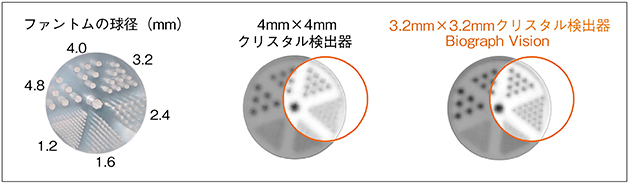 図3にMini-Derenzoファントムの小球の描出の比較例を示す。2.4mm球の描出においては,4mmシンチレータの検出器では球の識別が困難であるが,Biograph Visionにおいては明確に描出できており,実質的な空間分解能の改善が見られる。