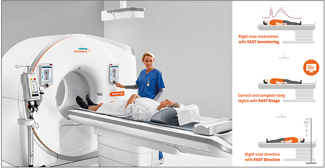 FAST 3D Cameraによる患者ポジショニングの自動化を起点とする“FAST Integrated Workflow”は,患者ごとに画質と被ばくを最適化したCT検査を実現することができる(図1)。まず,FAST 3D Cameraによって患者の三次元情報が取得され,検査部位に応じて適切なテーブル高が決定される(FAST Isocentering)。この時,位置決め画像取得のための撮影範囲も自動的に設定されるため(FAST Range),精度良くガントリ中心にポジショニングされるだけでなく,撮影開始位置へのテーブル送りも同時に行われる。位置決め画像取得後は,検査目的に合わせた撮影範囲の設定が自動的に行われ(FAST Planning),加えて,CT撮影が完了すると,適切な画像再構成の範囲や角度を自動認識する技術を応用して,任意の断面のMPR画像を直接作成することができる(FAST 3D Align)。