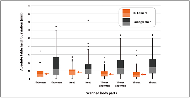 図2 FAST 3D Cameraによる自動ポジショニングの精度 腹部領域に関しては,平均数mmの誤差で患者ポジショニングが可能となっている。 (画像ご提供:オランダ・Erasmus MC, University Medical Center, Rotterdam, Ronald Booij, 他)