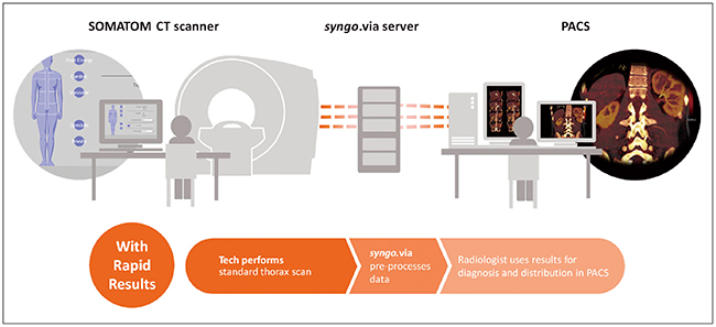 図3 Rapid Results Technology 事前にプリセットされたルールに基づいて自動的にdual energy解析を実施し,結果画像をPACSなどに送信する。