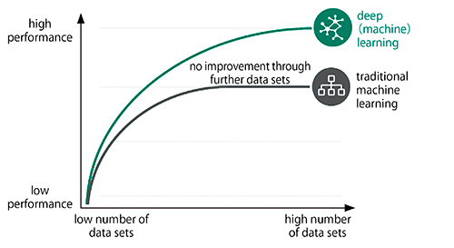 図1 従来の機械学習とディープラーニングの精度の違いを表す概念図