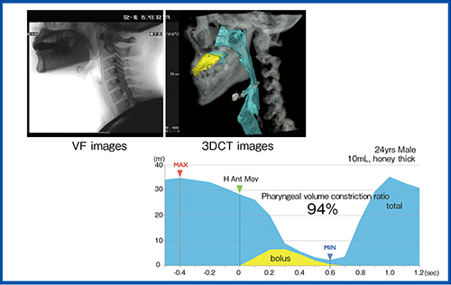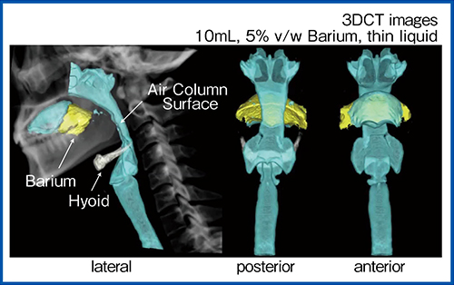 嚥下CTでは、面検出器による連続撮影によって嚥下時の動態の観察が可能になる。3DCT画像では、食塊が口腔から咽頭に流れ、舌骨喉頭が挙上し喉頭が閉鎖し咽頭が収縮して、食道へ流れていく様子を、任意の方向から観察が可能になる。下方からの視点では、嚥下中の声帯の動きの描出が初めて可能になり、これまで不明だった声帯閉鎖による気道防御の機序が明らかになった。