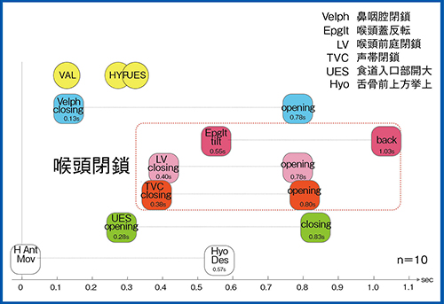 嚥下CTでは、動態の連続的な観察によって嚥下中の諸器官の運動時間計測が可能で、気道防御の重要なメカニズムである喉頭閉鎖の声帯閉鎖、喉頭前庭閉鎖、喉頭蓋反転の3事象を中心に、他の諸器官がどのように連動するかがわかってきた。図2は、とろみ水を用いた健常成人10人の嚥下中の諸器官の運動開始と終了時間を示したものである。嚥下CTによって運動時間や咽頭腔体積変化など定量評価が可能になり、CTによる三次元動態画像や定量評価は、治療に役立つ情報を得るための重要な評価法となっている。