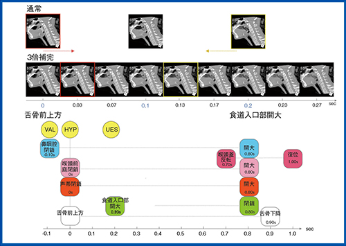 PhyZiodynamicsでは、フェーズ間のボクセルごとの形状や位置などの変化をトラッキングしてデータの補完を行うことで、時間分解能の向上とスムーズな動態の観察を可能にする。嚥下の3D画像では、3倍補完することで動きが滑らかになり全体像の把握が容易になった。これによって諸器官の運動時間の計測の際に、通常の動態画像での計測に加えて、PhyZiodynamicsによる補完画像を加えることで、元画像の運動開始・終了のタイミングの判断に有用であった(図3)。