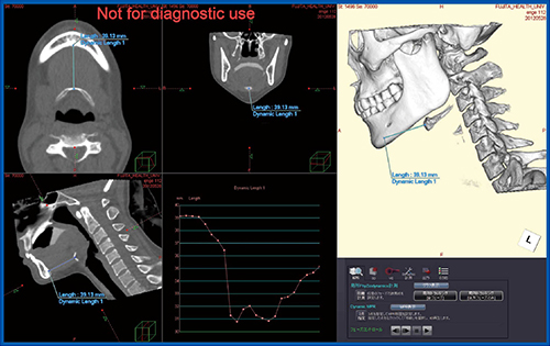 CTは筋肉の動態など軟組織の描出は困難だが、筋の起始と停止のポイントとなる舌骨上筋群や下筋群を点で追って、起始・停止長を計測することにより、筋の動態を類推することが可能になる。しかし、起始と停止の画像を1フレームずつ追っていく必要があり、時間がかかるという問題、さらには手動操作による誤差が避けられなかった。
