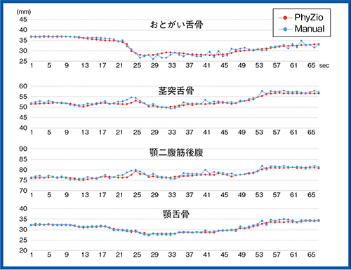 PhyZiodynamicsでは、ボクセルトラッキング機能によって、この起始・停止長の自動計測が可能になる(図4)。MPR画像や3D画像上で、最初のフレームで計測したいポイントを指定すると、その後のフレームで自動的にトラッキングが行われる。動きの速い舌骨においても、ほぼ自動化でき、大幅な計測時間の短縮が期待できる。計測の正確性についても、PhyZiodynamicsとマニュアルでの結果を比較したところ、両者のグラフはほとんど一致し、PhyZiodynamicsの方が、ズレのない結果が得られた(図5)。