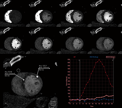 しかし、運動負荷や薬剤負荷を行うことで、非病変領域の細動脈が拡張し血液量が増えると、すでに予備能を使っている病変部では負荷を行っても血液量がそれ以上増えることはないため、正常部と病変部にコントラストが生まれる。また、冠動脈から細動脈に血液が供給される際、心筋外膜側から心筋内膜側に向けて血液を供給していくため、虚血や梗塞は心筋内膜側で優位に観測されることとなる。この虚血の機序を反映し、心筋血流をCTで画像化するためには、造影剤を投与し経時的に心臓全体を撮影することで、心筋へのファーストパスをとらえ、心筋血流を定量・定性評価することが可能になる(図1)。