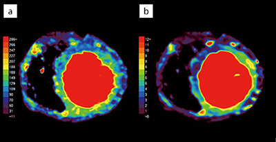 a:BF、b:BV。図1の患者であり、BF・BVともに前壁中隔に低下を認める。