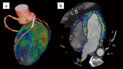 複数心拍を撮影し解析を行っていくことになるが、同一心位相をターゲットに撮影したとしても心拍の変動や心臓の生理的な動きにより、多少のズレが生じてしまうことが知られており、Perfusionの解析においても問題となってしまう。この問題に対しZiostation2の「CT心筋ダイナミック血流解析」では、最初に撮影したすべての時相に対し非剛体位置合わせを行い、位置ズレを補正してから解析することが可能であり、定量評価を行う上では重要であると考える。心筋ダイナミック血流解析ではmaximum slope法を用いた血流量(blood flow:BF)と、area under the curveから得られる血液量(blood volume:BV)が取得可能である(図2)。また、得られたデータをCCTAの画像にフュージョンすることも可能で位置ズレのないCCTA+心筋評価が任意方向から観察可能である(図3、4)。