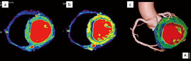 CCTAによる形態評価は、主に優位病変を見つけることを目的とし、併せてプラーク評価3)なども可能である。しかし、形態評価のみでは治療効果の予測が不十分であり、心筋虚血の評価が重要とされている。虚血評価においては冠血流予備比(fractional flow reserve:FFR)による虚血評価が循環器内科医からの信頼も高く、ゴールドスタンダードになりつつあるが、CAGと同様に侵襲的なカテーテル検査になることから患者負担が大きくなってしまう。非侵襲的な検査による虚血評価には、心筋シンチグラフィがありエビデンスも豊富にそろっていることから、確立している検査と言えるが、分解能が低く多枝病変や内膜側優位な虚血の評価などが困難であるなどの問題もある。