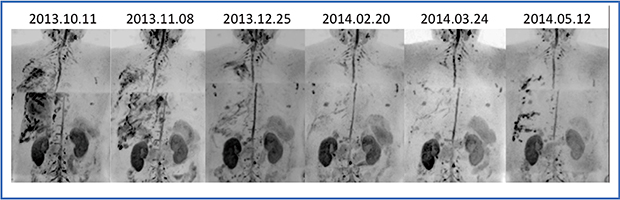 右胸膜に多数の病変が発生している。温熱療法による改善と,再発(右から2枚目と最後の画像)が一目でわかる。撮像間隔は,1〜2か月であるが,通常の保険請求範囲で撮像ができる。FDG-PETでは不可能な短期間ごとの観察能力は,治療効果の把握に非常に有用と思われる。