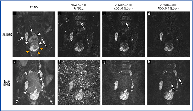 e:b=800 MIP画像では,膀胱(◀)や腹水(→),あるいは腎臓が背景信号として表示されている。こういった構造物に重なった,あまり信号強度が高くない病変は,MIP画像に表示されないことになる。fのb=2000のcDWIでは,元画像で認められた高輝度点が天の川のように認められ,内部の病変を見難くしている。gのADC<0をカット,hのADC<0.4をカットしたMIP画像では高輝度ピクセルとともに背景がよく抑制され,↑で示すような淡い高信号を示す転移リンパ節も明瞭になっている。