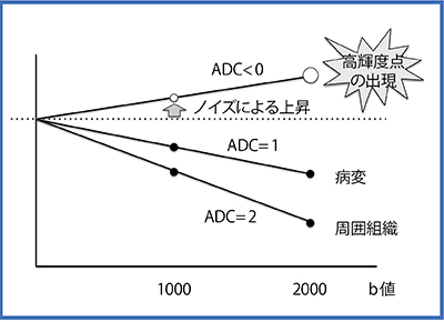b=1000において,ノイズが乗ることによりb=0よりも信号強度が高くなると,ADCは「負」となる(このグラフの線が右上がりとなる)。このため,cDWIでより高いb値の信号強度を計算すると,より高輝度を生じてしまう。