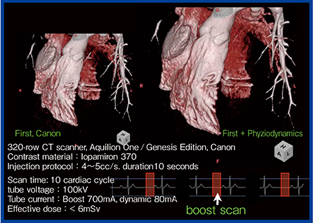 冠動脈フローマップは,320列ADCTを用いprospective ECG triggering法で撮影する。当初は拡張期のみ連続心拍で10〜15心拍を撮影していたが,現在は1回の本スキャンのみ線量をかけ(700mA),前後の10心拍は低線量(80mA)で撮影する“boost scan”を行うことで,低線量(4mSv)でCAGに近い冠動脈造影CTが得られている(図1)。逐次近似画像再構成の“FIRST”とPhyZiodynamicsを組み合わせることで,ノイズの少ない滑らかな画像が得られる。PhyZiodynamicsでは,motion coherenceによるノイズリダクション,非剛体位置合わせによって位置ズレの少ない正確な再構成が可能になる。