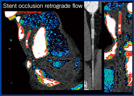 CT-FFRではステント留置症例の解析は適応外になるが,冠動脈フローマップでは留置症例に関しても解析が可能である(図4)。また,冠動脈フローマップの撮影では,通常と同じ造影剤量を使用するため,心筋のCT値も時間とともに若干上昇する。心筋の時間曲線(time density curves)のAUCを計測して心筋血流を評価する検討も行っている。これをPhyZiodynamicsで解析しMBF mapとしてカラーマップで表示したところ,LADの対角枝に高度狭窄のある症例では,支配領域の心筋の血流が落ちていることが確認できた。