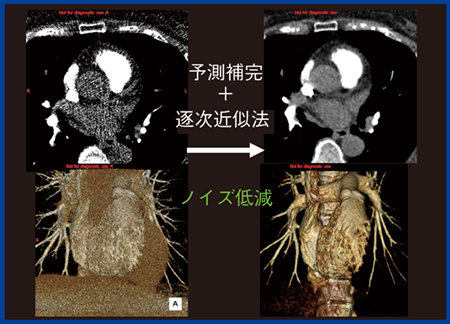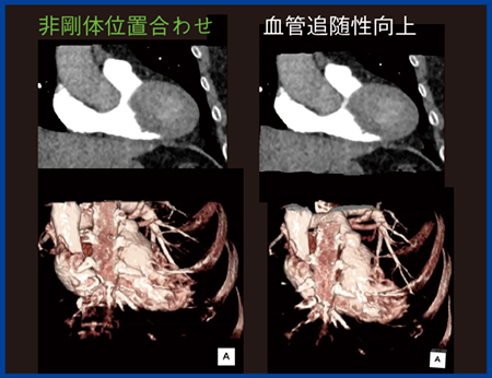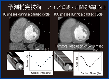われわれは,PhyZiodynamicsを用いた冠動脈のダイナミックCT Angiography(CTA)について2016年に報告した1)。冠動脈のダイナミックCTでは,320列CTでテストインジェクションによる冠動脈のピーク時の撮影と,レトロスペクティブECGゲーティングによる拡張期のみの連続10フェーズの“boost scan”によって冠動脈の連続撮影を行う。これにPhyZiodynamicsを適用することで,低線量でかつノイズの少ない滑らかな動態画像を得ることができる。PhyZiodynamicsでは,元画像のフェーズ間を任意の断面で補完することで仮想的に時間分解能を向上する予測補完技術(図1),CTの逐次近似画像再構成技術とPhyZiodynamicsの予測補完技術を組み合わせたノイズ低減(図2),非剛体位置合わせ機能による息止め不良などのモーションアーチファクトを低減するモーションコレクション機能(図3)などによって,冠動脈のダイナミックCTAの視覚化が可能になった。