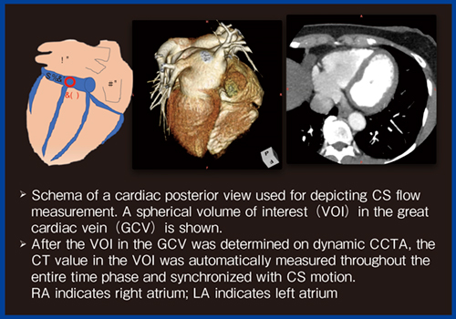 もう一つのアプローチが冠静脈のフローの定量化である。ダイナミックCTAでは,冠動脈だけでなく心筋から冠静脈に還る冠静脈洞(coronary sinus:CS)のフローの定量化も可能である。4Dモーション解析を用いてGCV(great cardiac vein)にVOIを置き,冠動脈から心筋を還流して右房に還るCSでのフロー(CSF)を計測した(図5)。大動脈の時間濃度曲線のピークの時間を始点として,CSの時間濃度曲線が増加し始めるタイミングとの差が心筋灌流末梢血管抵抗と相関すると考えて,その時間について検討を行った。冠動脈フローと同様にアンモニアPETのMFRとのバリデーションを行ったが,CSへの造影剤到達の遅延は,PETのMFRの低下と相関する結果が得られた。特にMFRでは2.0以上を正常として,2.0未満は予後不良とされているが,CSFの到達時間についても2.0未満の群では有意に遅延しており,これらのアプローチによってINOCA診断が可能になることが期待される。