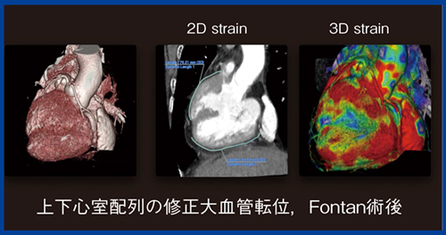 PhyZiodynamicsでもう一つ初期から取り組んできたのが,CTストレイン解析である。図6は,上下心室配列の修正大血管転位の症例でFontan術後の画像である。非常に複雑な形態の先天的な心奇形の症例だが,PhyZiodynamicsを使うことで2Dでも3Dでもストレイン解析が可能になる。この症例は,単心室でさまざまな心筋線維が混在しているが,動態解析によって単心室形態として同期性は保たれていることがわかる。PhyZiodynamicsを用いたCTストレイン解析については,2017年に田辺らから報告されている4)。修正大血管転位など成人の先天性心疾患の症例が多い当院では,心臓再同期療法(cardiac resynchronization therapy:CRT)でペースメーカーなどの補助デバイスが留置された患者が多く,MRIによる局所の機能解析を行うことが難しい。CTストレイン解析ではデバイスによるアーチファクトの影響を受けにくく,解析が可能になることがメリットである。