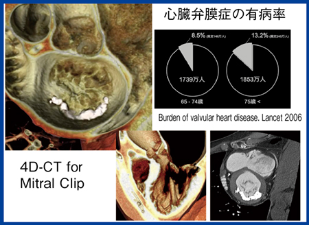 心臓弁膜症の有病率は,超高齢社会に伴い増加しており,TAVIやSHDに対するMitral Clipなど経皮的な人工弁置換術の施行件数も増えている。図7は,Mitral Clipの術前の4D-CTで,僧帽弁,大動脈弁,肺動脈弁の動きをとらえた画像だが,僧帽弁輪の下側に白く石灰化が描出されている。2D画像では弁尖と腱索が連動する動きがとらえられており,閉鎖不全を起こしていることがわかる。これらは,経皮的な弁置換術を行う循環器内科医にとって人工弁の留置位置の決定やクリップのサイズなどを決定するのに有用な情報となる。
