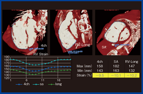 当院では,2023年からファロー四徴症に対する経皮的肺動脈弁置換術(transcatheter pulmonary valve implantation:TPVI)を行っている。ファロー四徴症は,術後遠隔期に肺動脈弁逆流が起こり,長期的に右室肥大・右室拡大を来たして不整脈や突然死に至るリスクが高まると言われている。従来は,開胸による肺動脈弁置換術(pulmonary valve replacement:PVR)が行われていたが,今後はより侵襲性の低いTPVIの普及が進むと考えられる。TAVIやTPVIなど人工弁置換術のより安全な施行のためには,術前の正確な解剖学的情報の取得が必要であり,4D-CTは必須の検査となる。4D-CTは解剖学的情報に加えて機能情報の提供が可能であり,さらに4チャンバービュー,右室長軸像(RV-Long),短軸像(SA)といった複数の断面でストレイン解析が可能になる(図8)。