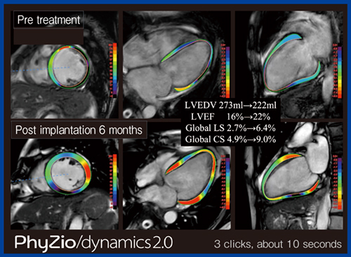 当院では,重篤な虚血性心筋症に対して人工多能性幹細胞(iPS細胞)から作成したiPS心筋球を心筋壁に移植して心臓の機能回復をめざす再生医療を行っている。図9は,上段が移植前,下段が移植後6か月のシネMRIで,PhyZio/dynamics2.0で解析した結果である。下壁に梗塞があり,バイアビリティは保たれているものの,全体に動きが悪く心機能が非常に低下していたが,移植後は全体的にストレインが改善しており,ストレイン解析でもホットカラーが確認され,視覚的にもよく動いていることがわかる。