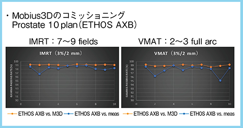 ARTの開始に向けては,コミッショニング(IMRT / VMAT),ワークフローチェックリスト作成(計画CT撮影後から照射開始まで),照射時のチェックリストおよび記録項目リストの作成,Mobius3Dのコミッショニングについて検討した。まず,IMRT / VMATのコミッショニングとして,ETHOSとEclipseでそれぞれ線量分布計算を行い実測と比較した。図1は結果であるが,JCファントムにおけるポイント線量の実測に対するETHOSとEclipseの誤差の平均値は同等であった(a)。三次元半導体検出器を用いた線量分布評価では,ETHOSはEclipseに比べてわずかにパス率が低かった(b,c)。また,小照射野のプランでは誤差が大きかった(○)。次に,ETHOSとEclipseのワークフローの違いを踏まえ,担当者や手順,注意事項などを記載したワークフローチェックリストを作成した。CBCT撮影から照射までの流れについてもチェックリストを作成。照射時のさまざまな作業や待ち時間などの記録事項を洗い出しリスト化した。また,毎回プランが変わるため,monitor unit(MU)も記録し,さらに,intra-fractional positioning errorの記録や,前立腺がんの症例ではターゲットとなる前立腺のfractionごとの体積も記録した。続いて,Mobius3Dによるプラン検証を行った。図2はコミッショニング結果の一部であるが,IMRT,VMAT共にETHOSとMobius3Dの計算値のγパス率は平均99.1%であり,ETHOSと実測検証のγパス率よりも高い,または同等であった。