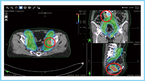 症例2は,子宮筋腫で子宮摘出後の腟断端に扁平上皮癌が発生した症例である(図2)。初発時に原発巣および左側方と傍大動脈のリンパ節転移を認めた。断端がんは大きく広がっているため,中央遮蔽は入れずに極力高線量を照射したいと考えた。さらに,リンパ節転移に対しては,標的体積内同時ブースト(SIB)で線量を上げ,制御を高めつつ安全な治療をめざした。そこで,ETHOS Therapyを行ったところ,腟断端にしっかりと位置を合わせつつ,リンパ節転移も外すことなく線量を上げたSIBを施行できた。