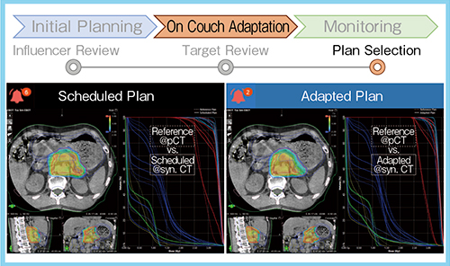 ETHOS Therapyは,Initial Planning,On Couch Adaptation,Monitoringで構成されている。Initial Planningでは,まず,線量処方や正規化,線量制約,重要度を設定後に,体輪郭や骨,肺などが自動で輪郭抽出される。ターゲットを含むその他の臓器は,放射線治療計画装置「Eclipse」とほぼ同じ機能を有する入力ツールを用いて手動で行う。その後,Intelligent Optimization Engineによる線量分布最適化および線量分布計算に続いて,最終線量計算が行われる。線量計算アルゴリズムはAcurosXBを用い,照射方法は7門,9門,12門の固定多門強度変調放射線治療(IMRT)と,2arc,3arcの強度変調回転放射線治療(VMAT)の5つから選択し,最終プランを決定する。On Couch Adaptationでは,まず,AIによるセグメンテーション後にターゲットが決定され,治療当日のCBCT画像に輪郭が移行される。次に,作成されたsynthetic CT(合成CT)上で線量分布計算が行われ,Scheduled PlanとAdapted Planのいずれかを選択する(図1)。その後,約2分で独立線量検証の結果が表示される。最後に,Monitoring画面にて,その日に照射したプランの記録と確認が可能である。