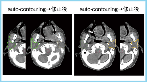 本症例は,60歳代,男性,左側舌がん術後・頸部リンパ節転移節外浸潤陽性である。治療計画は,initial planが両側頸部IMRT 9門・6MV-FFF・40Gy / 20fr,臨床標的体積(CTV):リンパ節転移腫瘍床+1cm・左levelⅠa・両側levelⅠb・Ⅱ-V・VⅡa-b,PTV:CTV+5mm,PTV D95%処方,boost planがリンパ節転移腫瘍床IMRT 9門・6MV-FFF・20Gy / 10fr,CTV:リンパ節転移腫瘍床+1cm,PTV:CTV+5mm,PTV D95%処方としている。図1はauto-contouringの画像であるが,耳下腺のわずかな修正のみで,大きな労力を割くことなくInfluencer Reviewを施行できた。続いて生成されるターゲットには大きなズレはなく(図2),本症例では一度もCTVを修正することなく照射プランを作成可能であった。次に,Scheduled PlanかAdapted Planを選択するが,Adapted Planの方が優れた値で線量制約を満たしており,本症例では全照射でAdapted Planを採用した。