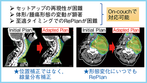 当院では,2022年4月よりOnline Adaptive Radiotherapy(oART)を開始した。現在までに約60症例を経験しており,特に頭頸部での有用性を実感している。頭頸部は再現性の良いセットアップが困難で,体形や腫瘍形態の変動が顕著であり,至適タイミングでの再計画も困難であるが,On-couch Adaptationで対応可能である(図1)。