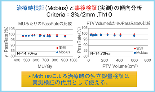 Mobius3Dにて,DVH解析,DVH Dose評価,3D-γ解析,線量プロファイル解析,ログ解析を行ったところ,結果はほぼ一致していた。また,治療時検証(Mobius3D)および事後検証(実測)では,いずれもDVH評価点(PTV)のdose differenceは1%以内であった。なお,Mobius3Dによる独立検証の精度は事後検証の精度と同等であり,Mobius3Dは実測検証を代用できると考える(図2)。