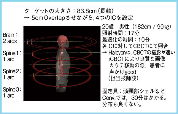 CSIやTBIにはいくつかの照射方法がある。従来法によるCSI(GAP法)では照射野につなぎ目が生じるほか,TBI(long SSD法)ではつなぎ目はないものの,広い治療室が必要であり,線量分布も不十分となる。寝台移動を伴うヘリカル照射では,つなぎ目はhead firstとfeet firstの境目部分のみであり,thread effectが生じるものの,CSI やTBIを施行可能である。一方,Halcyonでは,複数のアイソセンタを設定する必要があり,つなぎ目が生じるため,きれいな線量分布を作成して治療効率の良さを生かした治療が可能であるかが検討課題となった。