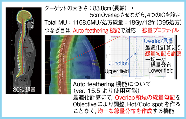 また,今回有用であった機能として,放射線治療計画装置「Eclipse」の“Auto feathering機能”がある。これを用いることで,オーバーラップ部分の線量勾配が最適化計算によってオブジェクティブにより調整されるため,hot / cold spotが生じることなく均一な線量分布が作成される(図2)。患者QAでは,三次元半導体検出器と電離箱線量計・固体検出器,線量測定用フィルムによる測定の結果,問題はなく,3%/2mmガンマパス率も96.3%と良好であった。