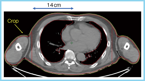 治療計画に当たり,頭頂部から足先まで撮像された身長162cmの男性症例のPET/CTのデータセットを使用した。本研究で最も重要なポイントは,planning target volume(PTV)の設定である。図1の黄色のライン(ー)は体輪郭,そこから3mm内側をPTVとし(ー),体の中心から左右に14cmの部分をPTV-BODY,その外側をPTV-ARMと設定して(図1),D98%,D95%,D50%,D2%を評価した。体幹部と腕を分けたことで,腕にも十分な線量が投与されるよう最適化を図った。