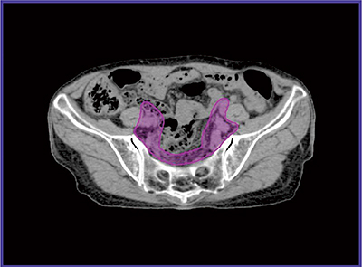 子宮癌に対する全骨盤照射では,かつては骨構造をランドマークとして照射野を決定する,二次元的な放射線治療計画が行われていた。三次元治療計画が一般化した現在,当院でも臨床的標的体積(CTV)を治療計画装置上で描画し(図1),これに適切なマージンを付与したものを計画標的体積(PTV)としている。子宮頸癌の臨床的標的体積については,国内外からガイドラインが発表されており1)〜3),当院もこれらのガイドラインを参考に標的体積を決定している。