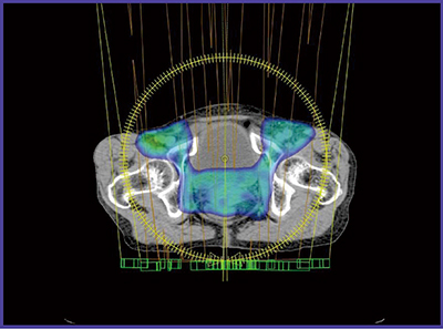 通常の全骨盤照射では,前後左右の4方向から10MVのX線を照射する。アイソセンタないしその近傍を標的基準点とし,同点に対して線量処方を行っている。