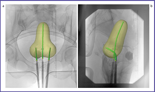 図4 直交する2方向のX線写真により作成された腔内照射計画例