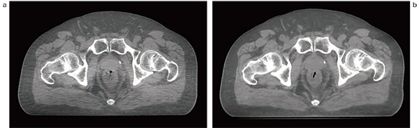 高精度放射線治療を行うには,直前に画像を取得し,患者の位置変位を計測・修正して治療を行うIGRTが必須である。TrueBeam Version2.7より,IGRTに必要なkVシステムによる位置照合cone beam CT(CBCT)において,散乱補正モデルおよび逐次近似法を用いた画像再構成技術であるIterative CBCT(iCBCT)が搭載された。これにより,画像のノイズの低減および散乱線アーチファクトなどの低減が図られることで,軟組織構造が良好に画像化され,高品質な画像での撮影が可能となった1)(図1)。特に,HyperArcでの位置照合時に脳転移病変周囲の脳溝や脳構造を確認できるため,安心して治療を行うことができる。