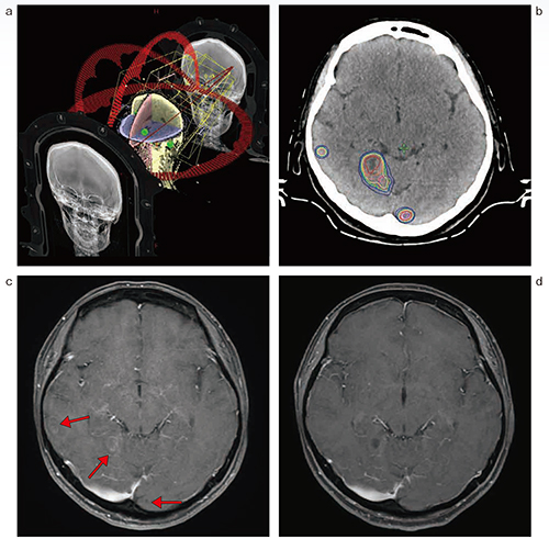 当院は2019年12月にTrueBeamを導入し,2020年4月よりHyperArcを開始した。当院の放射線治療装置は,食道がんなどの広範囲の放射線治療も行うため,マルチリーフコリメータはMillennium120 MLC(5mmリーフ40枚+10mmリーフ20枚)を導入している。そのため,HyperArcに関しては,5mm以下の病変については線量検証の点から線量や安全性が担保されない可能性があるため治療は行っていない。HyperArcの治療時には,臨床的標的体積(CTV)に対して1mmのマージンを付けて計画的標的体積(PTV)を設定しているため,実際には最低7mmのPTVに対して線量処方を行っている。5mm以下の病変に関しては,経過観察のMRIで増大時に再度SRS/SRTを検討する方針としているが,放射線治療後に分子標的薬や免疫チェックポイント阻害剤が使用されているためか,それらが増大して再治療となった症例はまだ見られていない。HyperArcに関してはこれまで9例に行い,照射した最大個数は