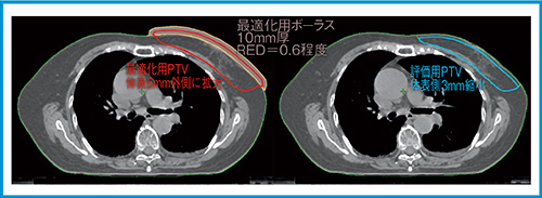 (1) 体表外側に仮想的にボーラスを作成し,最適化計算に必要な関心領域を体表外側へ拡大したstructure setを作成する(図2)。当院では体表外側に10mm厚ボーラス,relative electron density(RED)≒0.6(CT値:-400),最適化用PTVとして体表の5mm外側に拡大している。