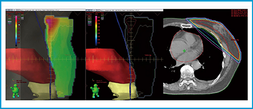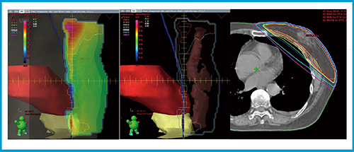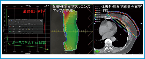 また,体表近くのターゲットに対するIMRT治療計画では,計画標的体積(PTV)を体表内側数mmまでとして最適化するのが一般的であり,従来の治療計画方法では体表外側まで照射範囲を拡大することはできない。この問題を解決する方法が,pseudo skin flashテクニックを使用することである。また,irregular surface compensatorまたは最適化計算によるフルエンスマップ作成および修正が,線量分布の改善に有用である。よって,上記2つのテクニックを駆使することで,FFFビームによる乳房接線照射の治療計画の質が向上すると考える。