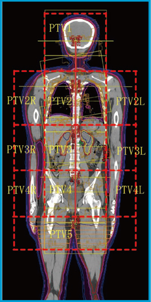 2プランの接合部はセットアップエラーによる過線量を考慮して大腿部とした。治療計画はbodyの輪郭描出後,体表から3mm内側の領域でorgan at risk(OAR)を3~5mmマージンで切り取ったものをplanning target volume(PTV)とした。水晶体,肺,腎臓をOARとした。全身各部位に効果的な最適化指示を行うため,頭部~体幹部領域は図1のように20~24cm間隔でPTVをPTV1~5と5分割,さらに,PTV2~4は正中,右端,左端と3分割した。プラン接合部のPTV5は,2cmごとに7分割した。下肢領域のPTVも大腿のプラン接合部,足指部分,それ以外と3分割し,大腿のプラン接合部はPTV5と同様に7分割した。