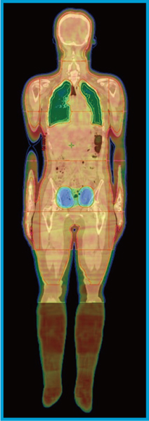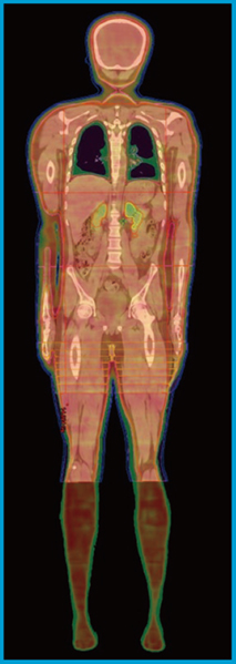 頭部~体幹部領域と下肢領域でおのおのプランを作成するため,計画CTはそれぞれの領域で撮影した。CTはシーメンス社製PET/CT「TruePoint Biograph16」のCT画像を使用し,2mmスライス厚,2mm gapで撮影した。CT撮影時のセットアップ用の正中線や水平線は,シェル,患者体表,Vac-Lokにマークした。頭部~体幹部領域はhead firstで頭部から膝下までの画像を取得した。下肢領域は頭尾側方向を反転させ,位置照合後,feet firstで足指から骨盤上縁までを撮影した。