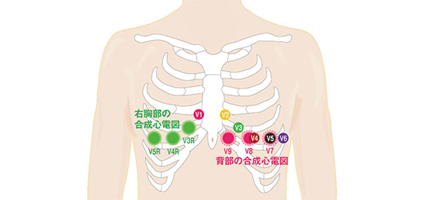 12誘導心電図からV3R,V4R,V5R,V7,V8,V9誘導の合成波形を作成し,解析します。また,責任冠動脈の解析と自覚症状の入力に基づき,問診解析と組み合わせてACS(急性冠症候群)の診断を補助します。