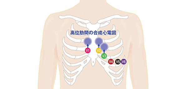 ブルガダ型心電図の予測に有用なV1~V3誘導の高位肋間心電図を作成・解析することができます。これにより,標準12誘導では捉えきれないブルガダ型心電図の疑いを感知し検出率を高めます。